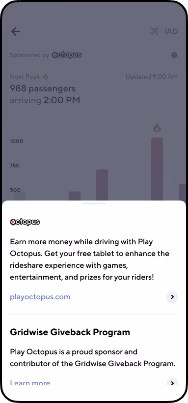 Visibility was key in introducing Octopus in new markets, so leveraging a static sponsorship placement in the Gridwise mobile app was crucial for branding. The placement also showcases Octopus as a contributor to the Gridwise Giveback Program, which provides gas subsidies to drivers to fight the ever-increasing costs associated with driving.