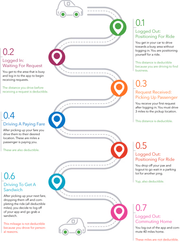 As a rideshare driver, there are 5 points in which you can track and deduct miles according to The Rideshare Guy.