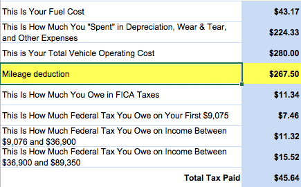 As you can see you have a total mileage deduction this week of $267.50 given a 53.5 cents per mile deduction.