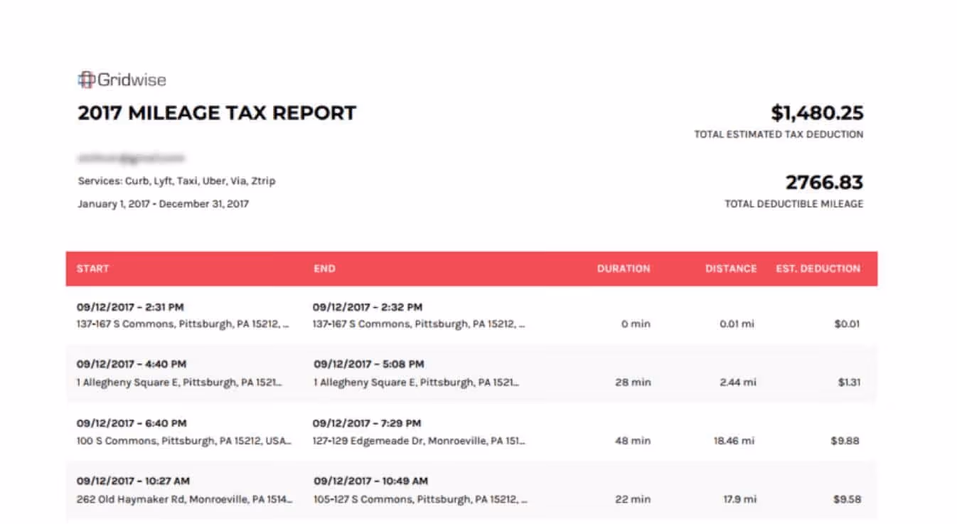 *Deduction estimates are based on the 2017 standard mileage rate of 53.5 cents per mile. Gridwise does not provide tax, legal, or accounting advice. This report has been prepared for informational purposes only. Gridwise is not responsible for the accuracy of the mileage recorded by the user or the resulting deduction estimates. You should consult your own tax or accounting professional.
