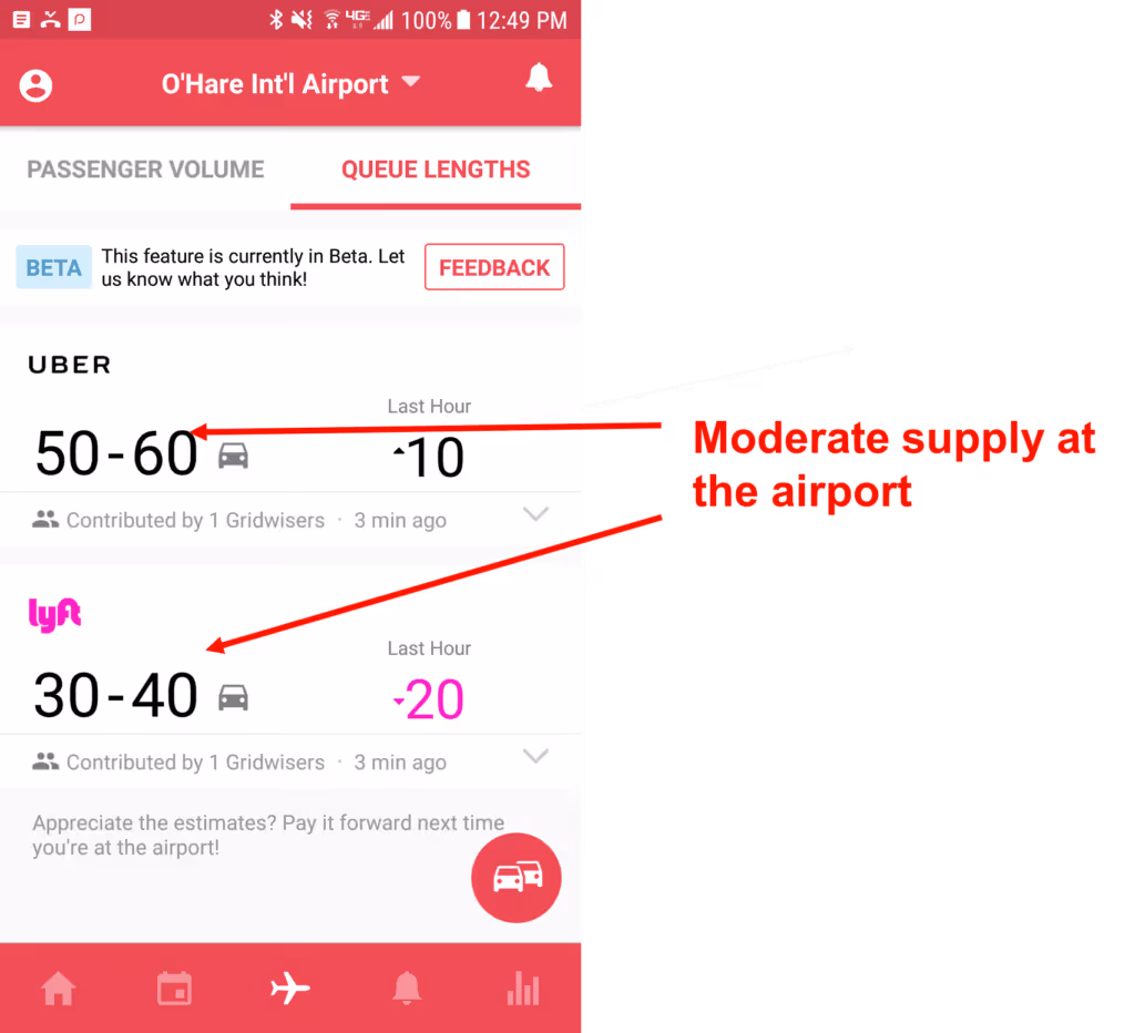 If you're an airport driver, increasing your trips per hour is all about figuring out when you should be at the airport. Check your Gridwise app to understand how many drivers are in the queue before you arrive and compare that to how many passengers are expected to be coming in.