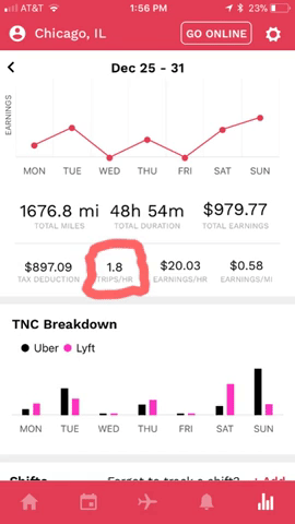 If you are a airport driver, you should be expecting a lower trip per hour number, however, if you are driving in a city or suburb where you will be spending less time waiting for rides, you'll hopefully have a higher trip/hr number.
