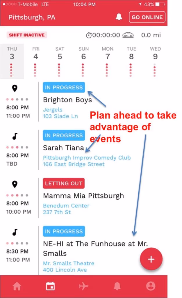 If you're not getting many rides, you need to start thinking of where the highest passenger demand with the lowest driver supply is. Start looking into what events are going on around your city to understand where and when certain areas will be ripe with potential passengers. This is a great opportunity to use your Gridwise app to check out what events are going on.