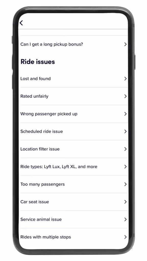 If, during or after a ride, it becomes apparent that there are issues with a customer, it’s always best to inform Lyft as soon as possible. Pull over, and go to your app under “Help.” Tap on “Ride and payment issues,” and a list of options will appear. You can report anything from being rated unfairly to a car seat issue, as you’ll see on the screenshot below.
