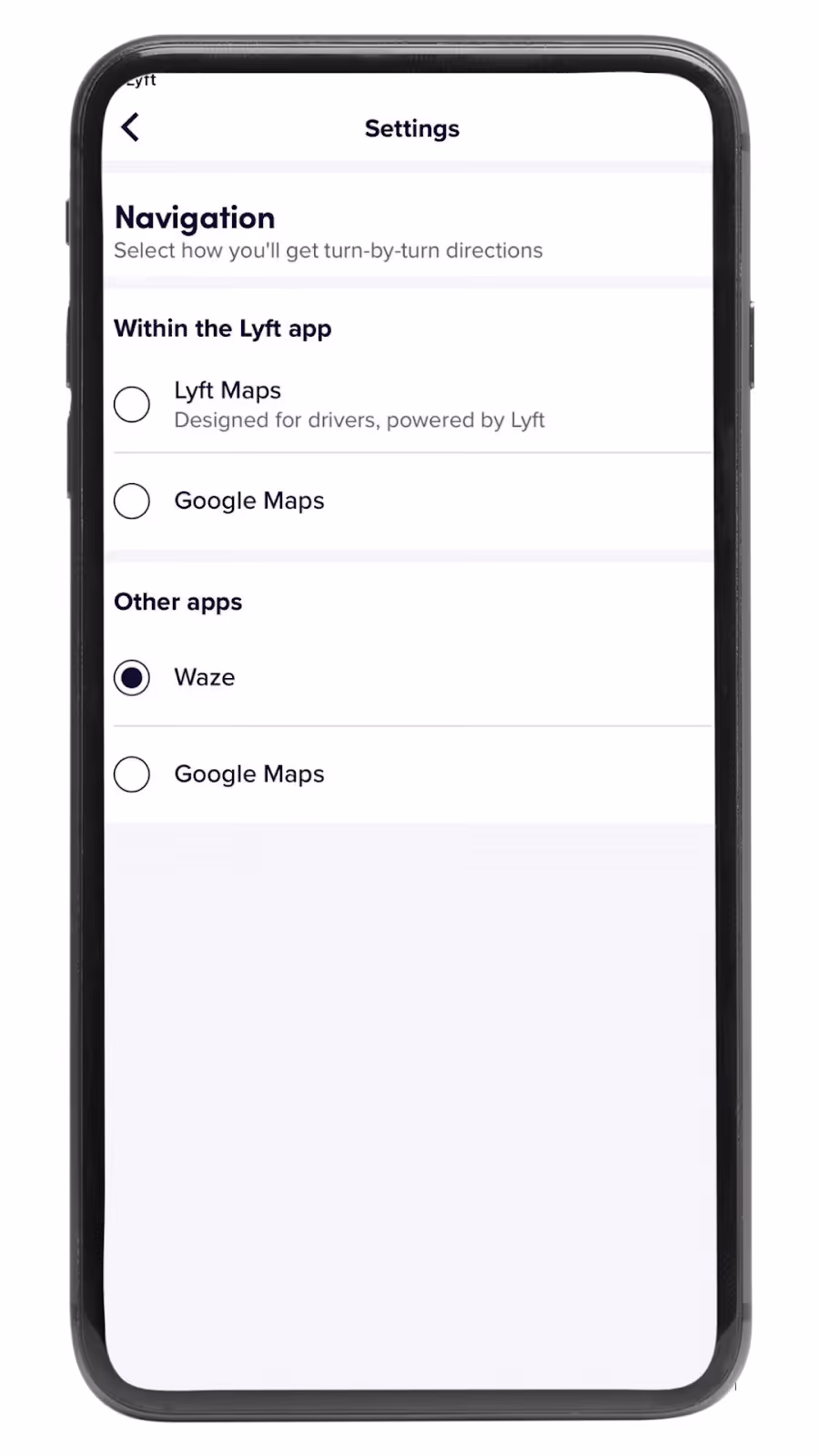 The Lyft app will automatically provide the route you’ll need to take. If you want to use a different GPS service, namely Waze, you can do so by indicating this in your settings under “Navigation.” Here you’ll note, too, that Google Maps can be used within the Lyft app.