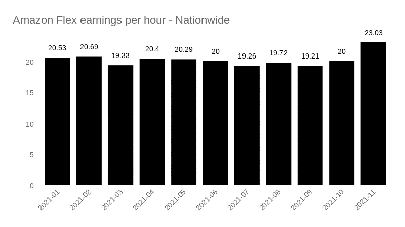 With Amazon Flex, you can get a pay rate that’s as good or better than that of UPS or FedEx. Our real-driver data show that nationwide median earnings from January to November 2021 averaged $20.22 per hour. Average earnings per trip were set at $5.90, which is also quite respectable.