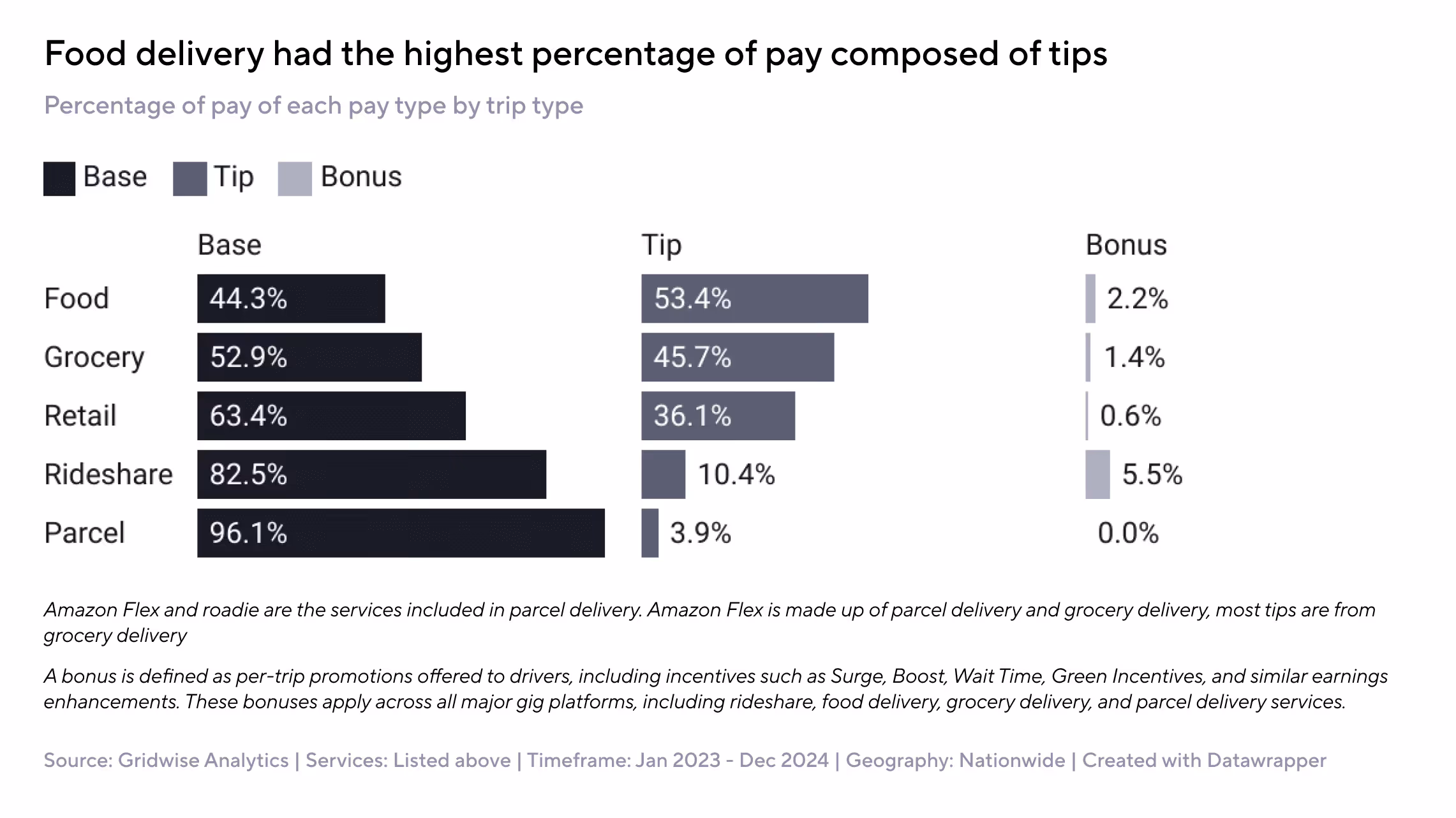 In 2024, 82.5% of rideshare driver earnings came from base pay, compared to 44.3% in food delivery and just 3.9% in parcel delivery.