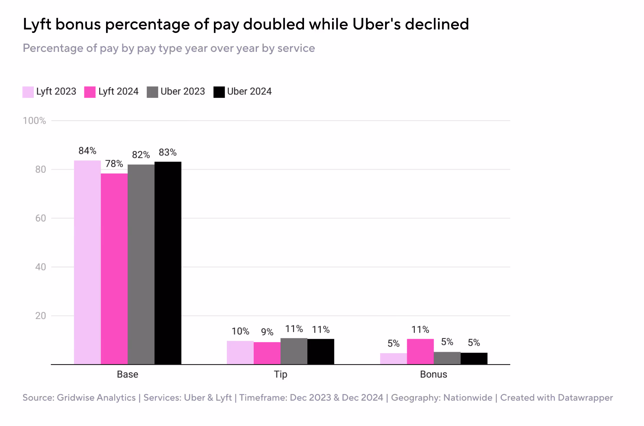 Bonuses made up 11% of Lyft driver earnings in 2024 — up from 5% the year before. Base pay dropped from 84% to 78%.